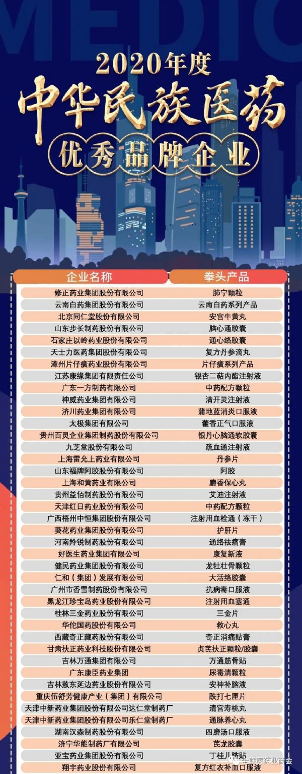全國工商聯醫藥業商會通過企業申報、地方工商聯推薦、各專業分會信息匯總以及網絡數據分析等途徑,經過秘書處統計整理,綜合市場銷售額、行業占比、品牌認知、科技創新、國際化程度以及企業專精特新的特點等因素,報評審委員會評選出“2020 年度中華民族醫藥優秀品牌企業”。本次評選,旨在弘揚民族醫藥、打造民族品牌,樹立行業標桿、發揮榜樣作用、促進民族醫藥產業健康發展。