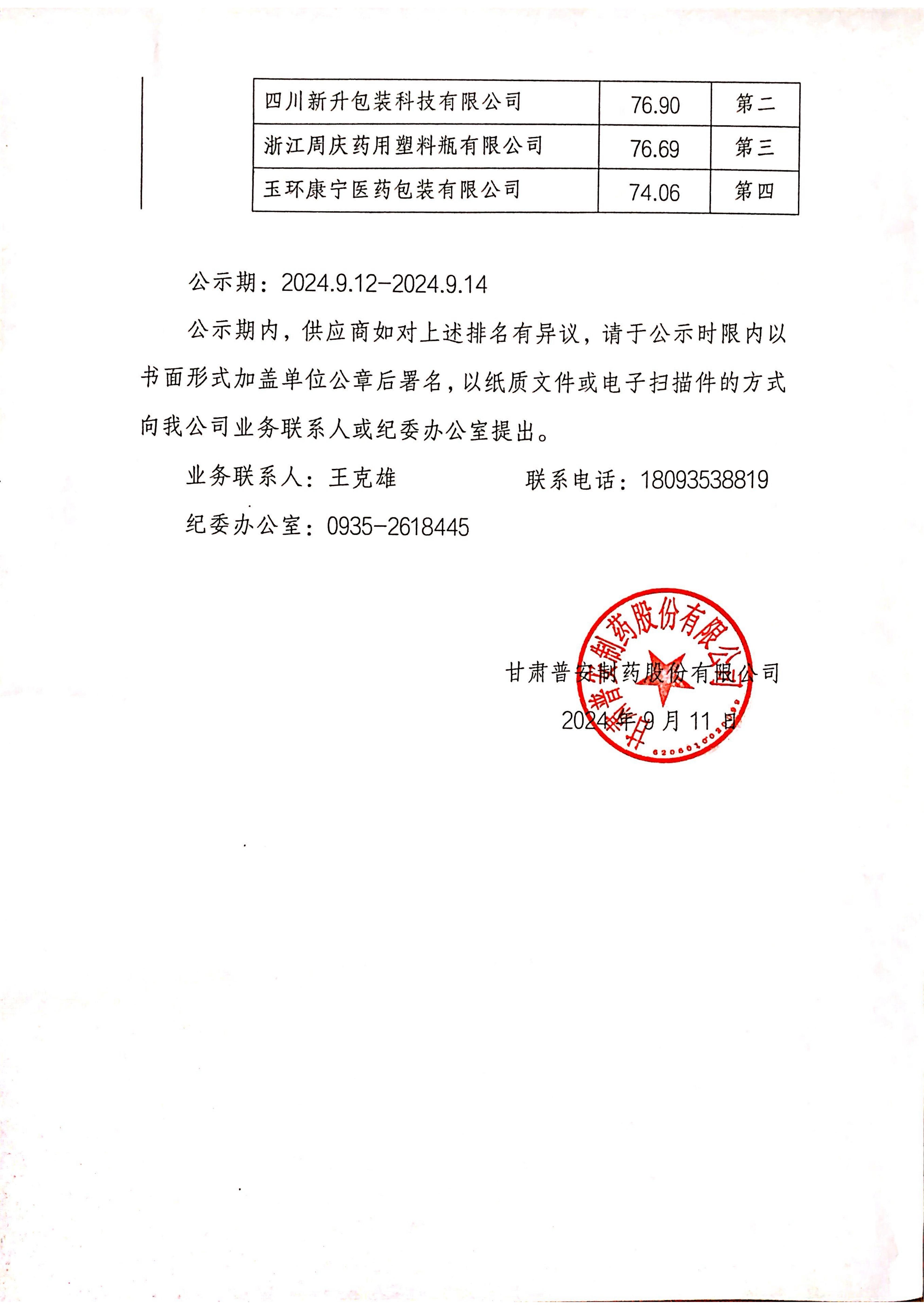 甘肅普安制藥股份有限公司2024年8月1000萬(wàn)盒宣肺止嗽合劑包裝材料補(bǔ)充招標(biāo)采購(gòu)結(jié)果公示