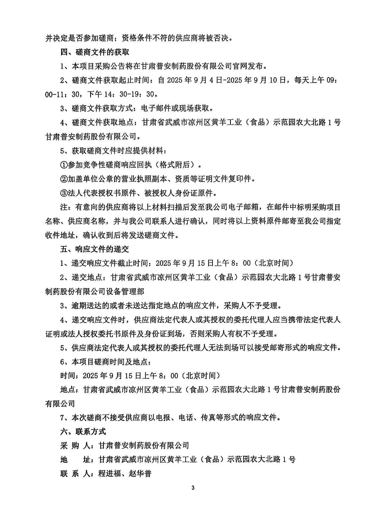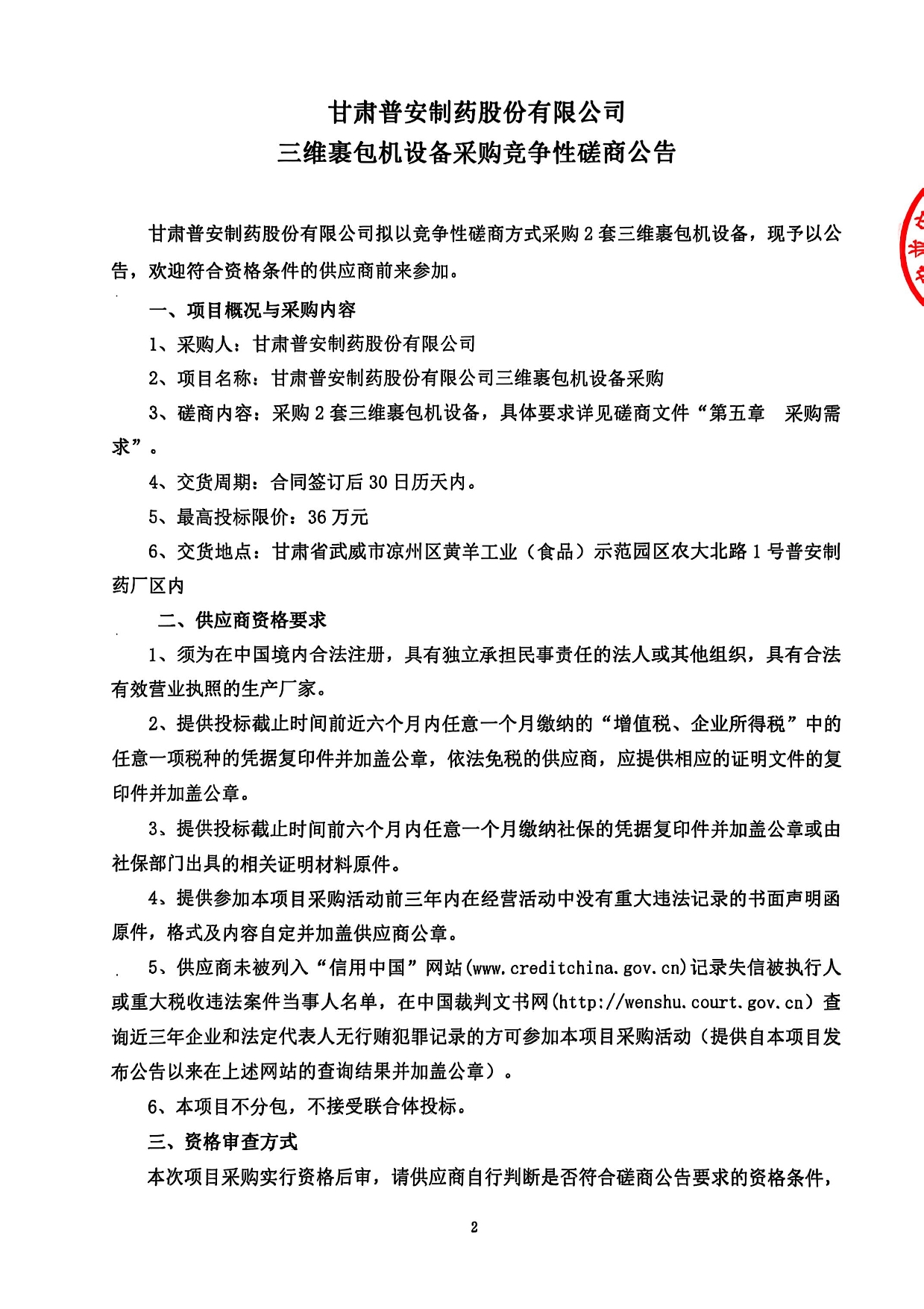 甘肅普安制藥股份有限公司三維裹包機設備采購競爭性磋商公告